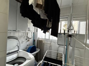 Banheiro social completo e área de serviço discreta e ventilada.